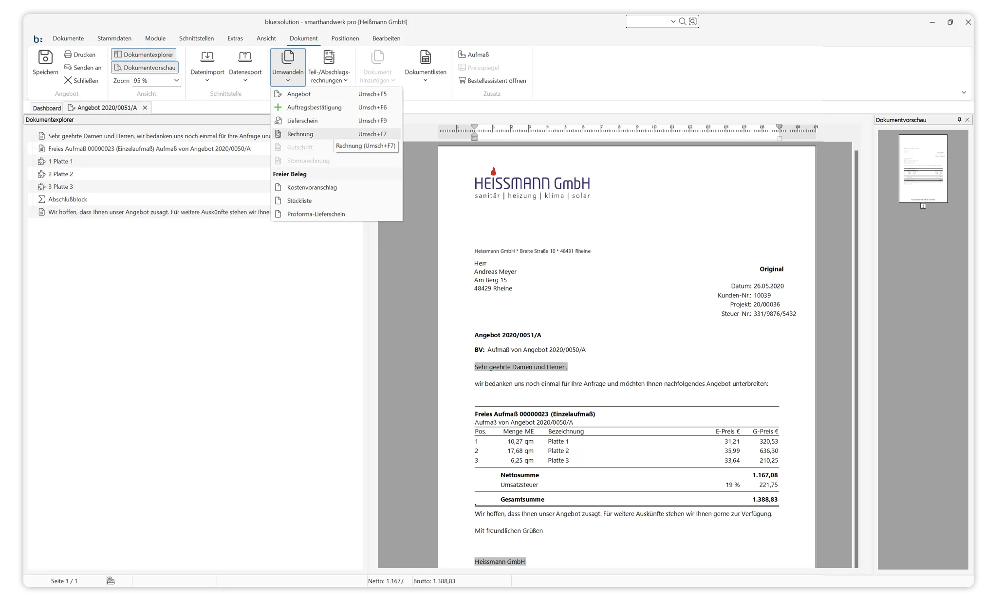 Sind die Aufmaße erst mal im Aufmaß-Center erfasst, haben Sie natürlich die Möglichkeit ein zusammenfassendes Aufmaßblatt zu exportieren. Darüber hinaus findet bei der Erfassung der Aufmaße bereits eine Zuordnung von Artikel- und Leistungspositionen statt. Damit sparen Sie sich im Nachgang wertvolle Zeit, denn Maßketten müssen nicht wiederholt für jedes neue Dokument erfasst werden. Stattdessen können Sie einfach Dokumente, wie z.B. Angebote oder die Abrechnung nach Aufmaß, direkt aus dem Aufmaß-Center ableiten.