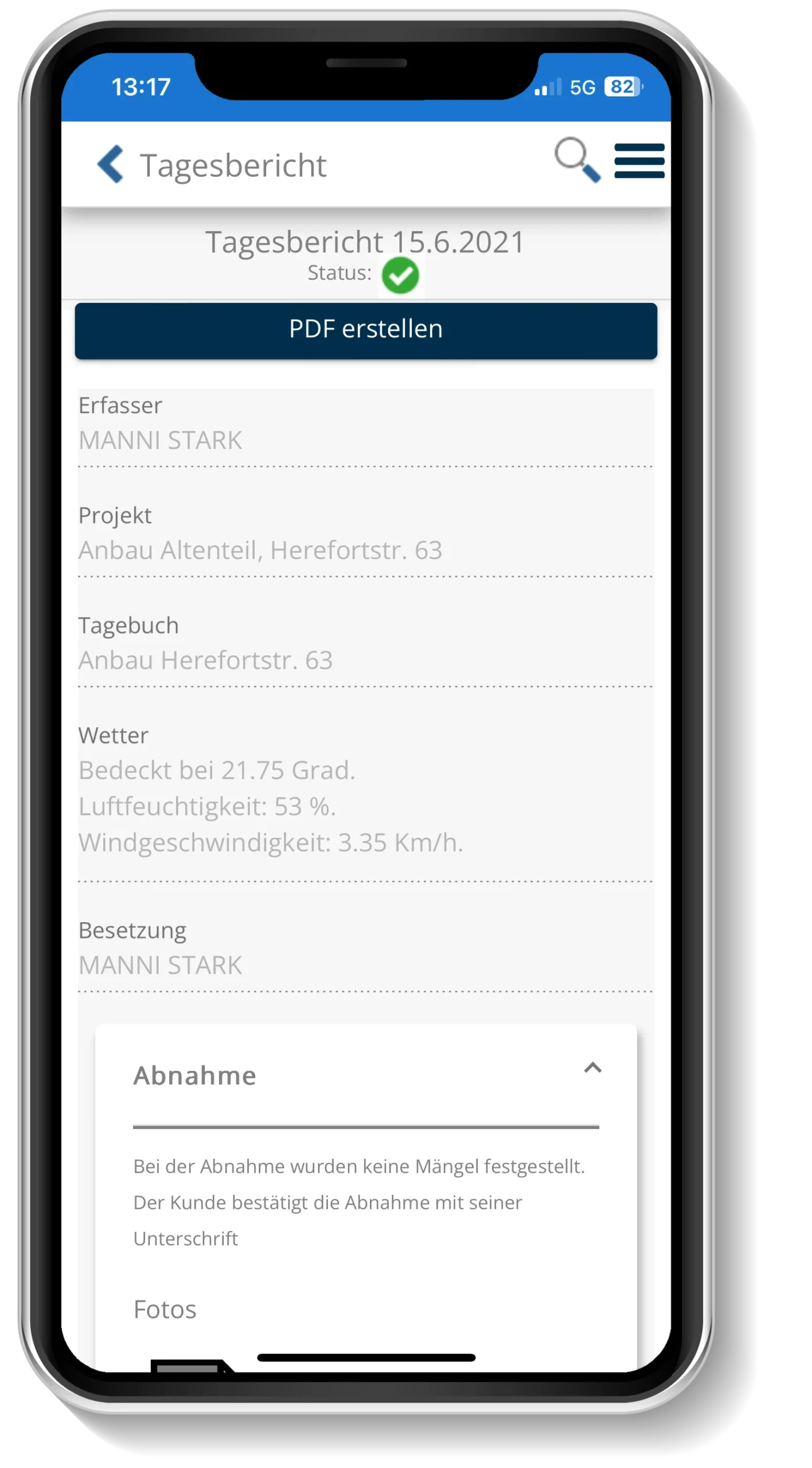 Vom umfangreichen Baustellentagebuch, über einen einfachen Bautagesbericht bis hin zum einzelnen Abnahmeprotokoll – mit smarthandwerk wird die Baustellendokumentation wieder zur Nebensache. Und damit Sie noch mehr Zeit für Ihr Handwerk haben: Erledigen Sie die Dokumentation mit unserer Bautagebuch App direkt vor Ort.