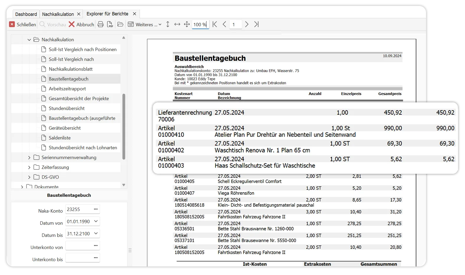 Erfassen Sie auftragsbezogen Artikel- und Leistungspositionen sowie Löhne, um diese später einem Nachkalkulationskonto zuzuordnen. Die Kosten werden dabei – ähnlich wie in einem Baustellentagebuch – in Form von Belegen festgehalten. Sparen Sie dabei effektiv Zeit: In smarthandwerk können Sie Artikel dank diverser Schnittstellen direkt aus dem Artikelstamm Ihres Großhändlers importieren. So werden auch direkt tagesaktuelle Preise und Artikelbeschreibungen mitgeliefert!