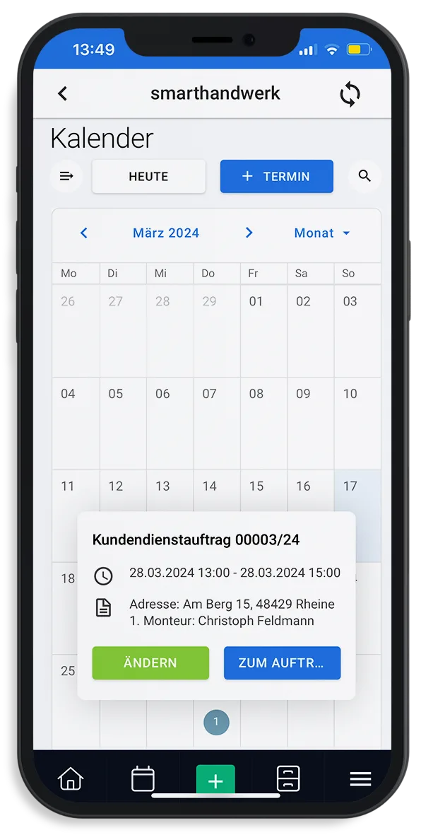 Mit der smarthandwerk App stehen Ihnen wichtige Funktionen unserer Dachdecker Software mobil zur Verfügung. Unter anderem können jederzeit anstehende Termine im Kalender eingesehen und wichtige Kundendaten (wie z.B. Adressen und Belege) abgerufen werden. Sie dokumentieren regelmäßig mit Hilfe von Bildern den Fortschritt Ihrer Arbeit? Dann legen Sie die Bilder direkt zum Auftrag ab. Die App wird automatisch mit der Software synchronisiert, sodass keine manuelle Übertragung notwendig ist.