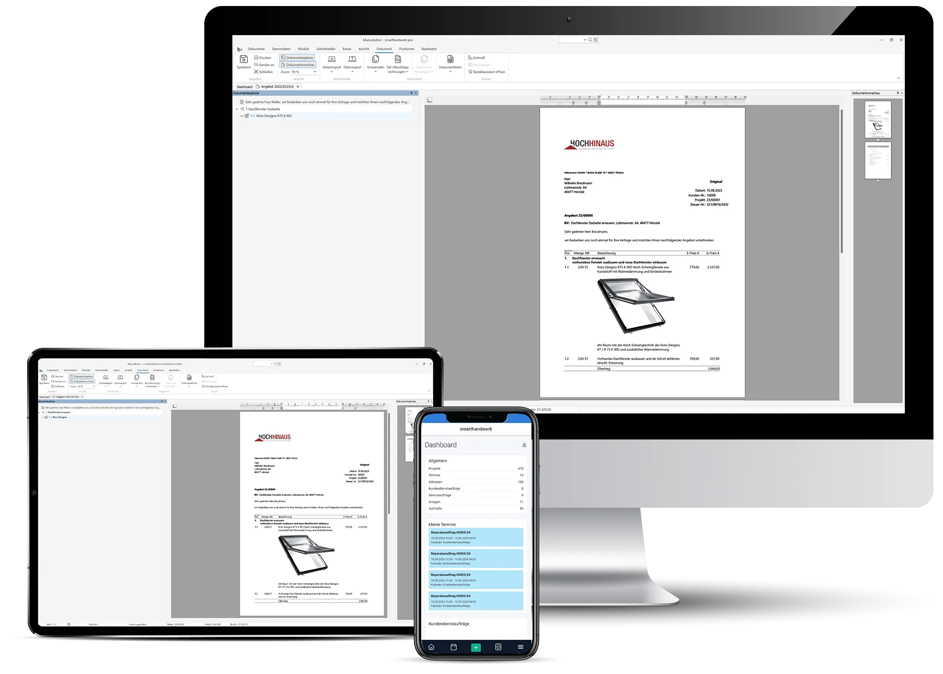 Sparen Sie sich darüber hinaus wertvolle Zeit bei der Abwicklung von Reparaturaufträgen. Schicken Sie Ihren Mitarbeitern alle wichtigen Daten und Dokumente ganz einfach auf Ihr Smartphone. Nach Abschluss des Auftrag kann die Unterschrift des Kunden sogar direkt eingeholt werden: Lassen Sie Ihn einfach auf Ihrem mobilen Endgerät unterschreiben. Damit reduzieren Sie nicht nur Ihre Zettelwirtschaft, sondern können unmittelbar im Büro Ihres Dachdeckerbetriebs die Rechnung stellen!
