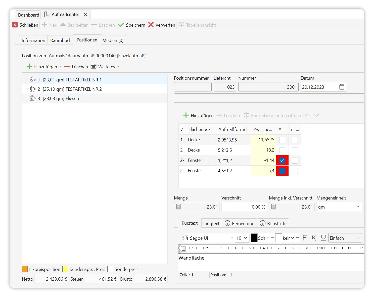 Mit Hilfe von Raumbuchvorlagen und dem Formelassistenten ist das Raumaußmaß oder freie Aufmaß für Ihre Malerarbeit im Handumdrehen digitalisiert. Sparen Sie sich das Mühevolle Eintippen von Maßketten in jedem neuen Dokument. Ein Mal erfasst, bildet das gewählte Aufmaß die Grundlage für Ihre Kalkulation, Angebots- und Rechnungserstellung. So ist Ihre Abrechnung nach Aufmaß mit nur wenigen Klicks erstellt!