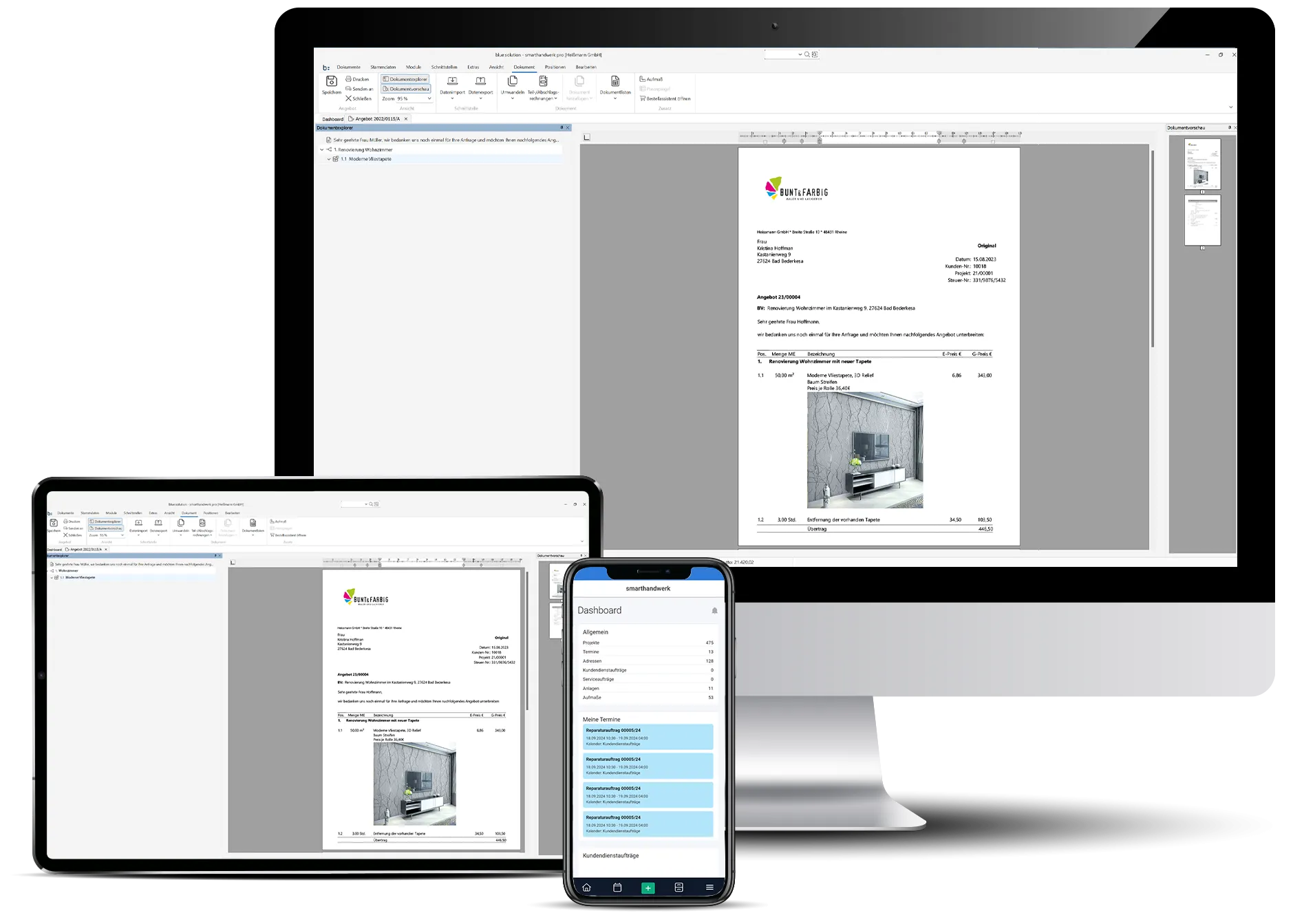Ob im Büro Ihres Malerbetriebs, beim Kunden vor Ort oder nach Feierabend von zu Hause – arbeiten Sie wo und wann Sie wollen. Unsere Handwerkersoftware für Maler gibt es nämlich auch als Cloud-Version. Rufen Sie die Funktionen Ihres Malerprogramms einfach über den Internetbrowser eines beliebigen Endgeräts auf.