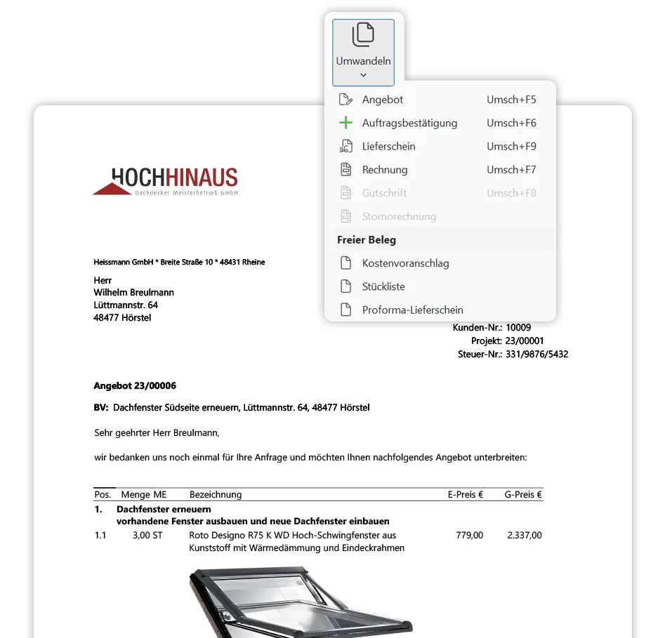 Mit Hilfe des Formulareditors können Sie darüber hinaus Ihren Geschäftspapieren den letzten Schliff verleihen. Fügen Sie z.B. das Logo Ihres Dachdeckerbetriebs und einen Briefkopf ein. Der Außenauftritt wirkt so direkt professionell und hinterlässt beim Kunden einen kompetenten Eindruck.