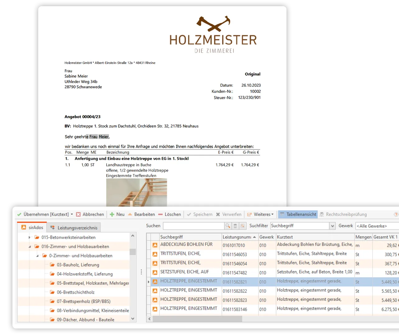 Damit Sie weniger Zeit mit der Angebotserstellung verbringen, haben wir smarthandwerk mit einer Vielzahl von Schnittstellen ausgestattet. Vorkalkulierte Leistungen können mit nur wenigen Klicks in Angebote und Rechnungen übernommmen werden. Importieren Sie dazu einfach relevante Leistungskataloge wie den “LeistungenDACH” von Icking oder die Kalkulationsdaten von Sirados in Ihre Software für Zimmerer.