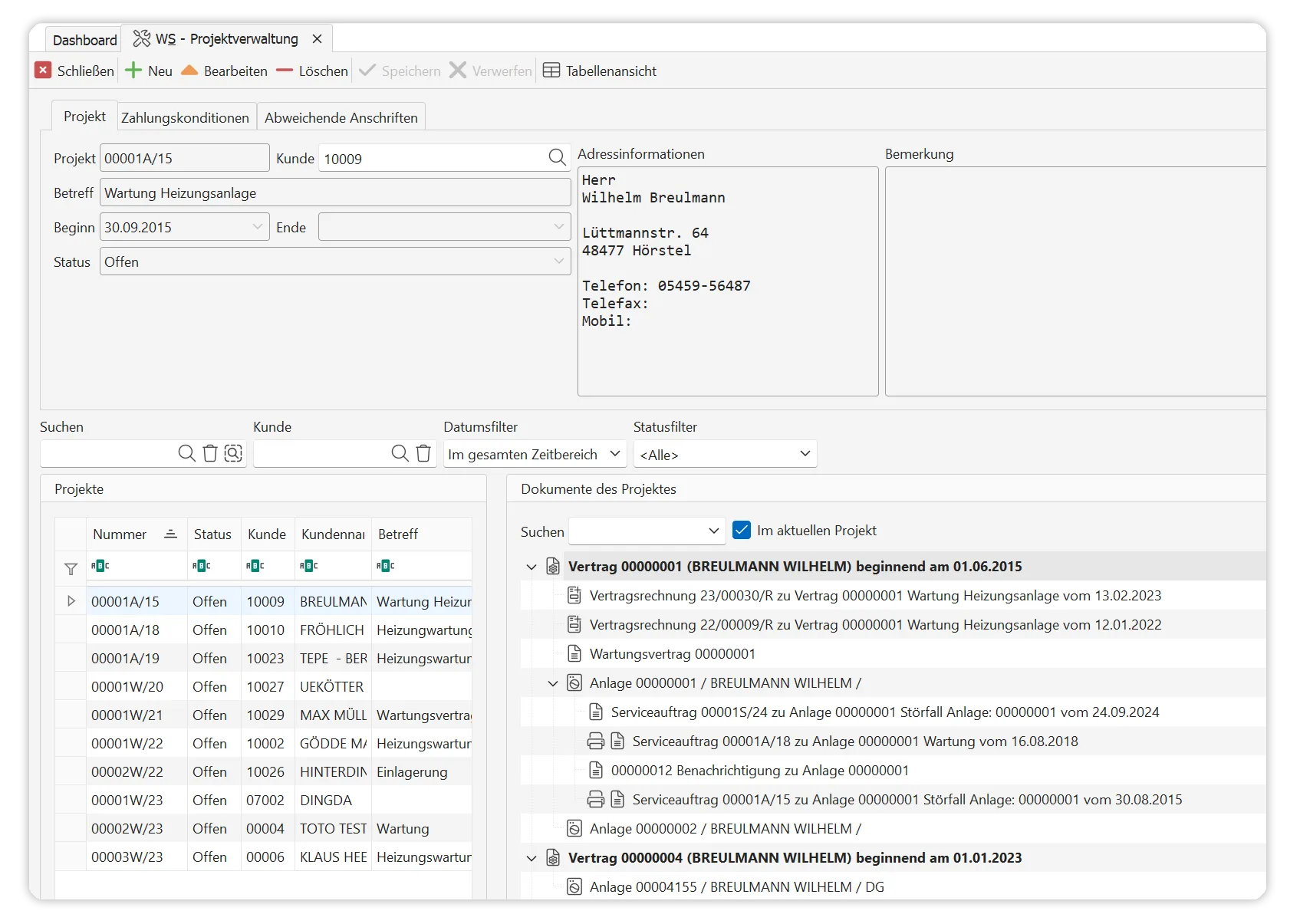 Legen Sie einfach zu Ihren Kunden Projekte an. Hinterlegen Sie Adressen, Zahlungskonditionen und verknüpfen oder erstellen Sie neue Dokumente. Alle projektbezogenen Wartungsverträge und Anlagen werden übersichtlich in einer Baumstruktur dargestellt. Einer schnellen Navigation durch Ihren “digitalen Aktenorder” steht also nichts mehr im Wege!